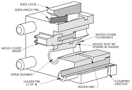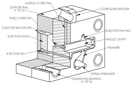 - La "línea de separación": representa el punto en el que se unen dos lados diferentes de un molde. La ubicación de la línea de separación define qué lado de la matriz es la tapa y cuál es el expulsor.[13]
