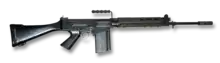 El rifle de batalla más duradero de la Guerra Fría es el FN FAL . El FAL es un rifle de tiro selectivo, producido por la empresa belga FN Herstal , que dispara 7,62 x 51 mm OTAN desde 20 o 30 cargadores de caja redonda. Se produjo por primera vez en 1953, momento en el que todas las naciones del Pacto de Varsovia estaban equipadas con el AK-47 , o alguna variante del mismo, pero la mayoría de los países de la OTAN tenían sus propios diseños de producción nacional. Por ejemplo, el Reino Unido utilizó Lee-Enfield , Estados Unidos , M1 Garand y Francia , elMAS-49 . Se suponía que el FAL resolvería este problema, sin embargo, Estados Unidos decidió no adoptarlo, principalmente porque su propio diseño, el rifle M14 , era una libra más liviano, menos complejo internamente y había un beneficio financiero para Estados Unidos al producir a nivel nacional. En el momento de su creación, fue adoptado por varios países de la OTAN, entre ellos Bélgica , Luxemburgo , Holanda , entre otros. El Reino Unido fabricó su propia versión del FAL, el rifle de carga automática L1A1 , que es semiautomático . Aunque los rifles de asalto son típicamente más comunes en el uso contemporáneo, el FAL todavía está en servicio activo en muchas naciones (ninguna de las cuales está en la OTAN), sobre todo Brasil . En total, el FAL ha sido utilizado por más de 90 países, y se han producido más de siete millones, lo que lleva al otro nombre no oficial del rifle: "El brazo derecho del mundo libre''.