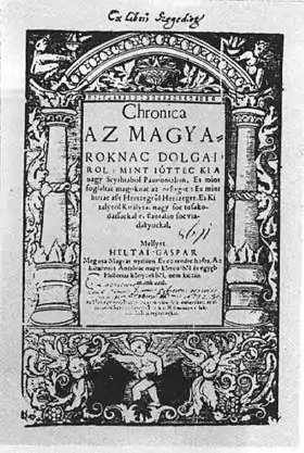 La obra más voluminosa de Heltai es su reelaboración y traducción del Rerum Hungaricum Decades (Diez Volúmenes de Asuntos Húngaros) de Antonio Bonfini, que publicó Heltai en 1575 como Chronica az magyaroknak dolgairól (Crónica de las Acciones Pasadas de los Húngaros).[9] La obra se imprimió en Kolozsvár (Cluj-Napoca).[9]