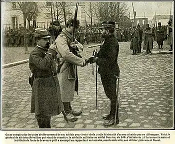 - Pie de foto: «Son incontables los actos de entrega de nuestros soldados hacia sus jefes; esta fraternidad de armas no existe en Alemania. He aquí al general de división Réveilhac entregando la medalla militar al soldado Derrien, del 248.º de Infantería; estrecha su mano y lo felicita por el acto de valentía que llevó a cabo al llevar a sus espaldas, bajo la metralla, a su oficial gravemente herido.»