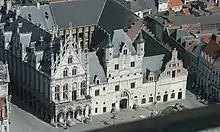 Stadhuis de Malinas[5] junto con el Palacio del Gran Consejo -Paleis van de Grote Raad-[6] (en construcción desde 1526, no fue terminado hasta el siglo XX), en la Gran Plaza o Plaza del Mercado[7] -Grand Place, Grote Markt- vista desde la catedral. Esta ciudad -Malines, Mechelen- acogió a comienzos del siglo XVI la corte de Margarita de Austria (el palacio de Saboya, Hof van Savoye, el primer ejemplo de arquitectura renacentista en Flandes).