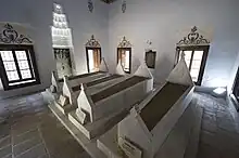 ![]() Vista hacia el interior del mausoleo de Gülruh, la tumba de esta es la primera del lado derecho si es mirado de espaldas y de frente seria la primera del lado izquierdo | ||