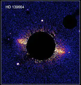 Un estudio sobre 22 estrellas cercanas realizado por el telescopio espacial Hubble de la NASA ha revelado la presencia de un disco circunestelar alrededor de g Lupi, similar al cinturón de Kuiper que rodea al sistema solar, que a una distancia de 109 UA de la estrella termina bruscamente.[5] El disco aparece casi de perfil, con un borde exterior bien definido que puede evidenciar la existencia de un compañero invisible que mantiene «acotados» a los escombros de polvo y hielo, de forma similar a las lunas pastoras que recortan los bordes de los anillos alrededor de Saturno y Urano.[6]