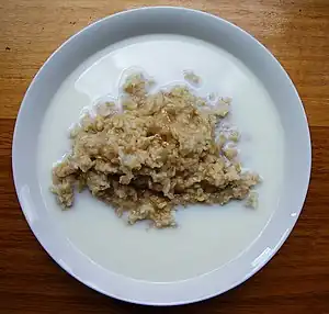 conocidas simplemente como porridge (‘gachas’) en el Reino Unido, Australia, Irlanda, Nueva Zelanda y Canadá, y como oatmeal (‘harina de avena’) u oatmeal mush (‘puré de harina de avena’) en Estados Unidos. Son también un desayuno tradicional en Escandinavia e Islandia, conociéndose como havregrød en Dinamarca, havregrynsgröt en Suecia, havregrøt en Noruega, hafragrautur en Islandia, y kaurapuuro en Finlandia. Se han hallado gachas de avena en los estómagos de cuerpos preservados de humanos del Neolítico en el centro de Europa y Escandinavia.[3] Algunas variedades de las gachas de avena son: