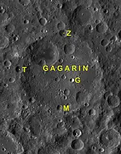 Por convención estos elementos son identificados en los mapas lunares poniendo la letra en el lado del punto medio del cráter que está más cerca de Gagarin.