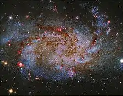 La galaxia del Triángulo (también conocida como galaxia espiral M33, Objeto Messier 33, Messier 33, M33 o NGC 598) es una galaxia espiral localizada en la constelación del Triangulum. Con entre 30 000 y 40 000 millones de estrellas[3] es pequeña en comparación con sus vecinas mayores, la Vía Láctea y la galaxia de Andrómeda que tienen, respectivamente, entre 200 000 y 400 000 millones y un billón de estrellas, pero su tamaño es parecido al del resto de galaxias espirales del universo.