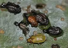 Galerucella nymphaeae, adulto y larvas.