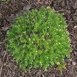 Es una hierba baja, perennifolia en aglutinación o formando esterillas de no más de unos 22 centímetros. Las hojas de color verde-gris, son estrechas, como agujas y crecen en verticilos de cuatro en las ramas delgadas. Cada una es de hasta un centímetro de largo y tiene una punta afilada como la punta de un cabello. La planta es dioica, con individuos que llevan flores masculinas o femeninas, las flores masculinas se producen en racimos y las flores femeninas son solitarias. Estas son de color amarillo verdoso. El fruto es una baya.