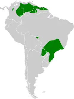 Se distribuye separadamente en Colombia, Venezuela, Guyana, Surinam, Guayana Francesa y el extremo nordeste de Brasil y al sur se encuentra en Bolivia, Paraguay, sureste de Brasil y probablemente también en Uruguay y nordeste de Argentina.[1]