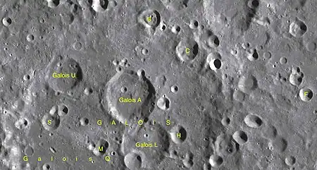 Por convención estos elementos son identificados en los mapas lunares poniendo la letra en el lado del punto medio del cráter más próximo a Galois.