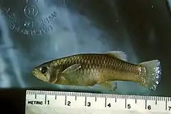 - Esta obra contiene una traducción derivada de «Gambusia gaigei» de Wikipedia en catalán, publicada por sus editores bajo la Licencia de documentación libre de GNU y la Licencia Creative Commons Atribución-CompartirIgual 4.0 Internacional.