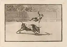 Francisco de Goya en uno de los grabados más conocidos que realizó para la serie la Tauromaquia representó al torero Juanito Apiñaniz realizando el salto con la vara.[13]
