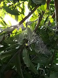 La hembra teje telas levemente inclinadas entre la vegetación. En ocasiones es posible observar al macho en una tela adjunta a la de la hembra o bien acompañándola en la misma tela. Las telas de la hembra poseen de 10 a 30 líneas espirales y se expande de 30 a 60 cm de largo. Esta araña tiende a dirigirse hacia la vegetación cercana cuando es molestada como mecanismo de protección. También se ha observado a esta araña adhiriendo su saco de huevos al envés de hojas de plantas cercanas a la tela, raras veces la araña pone el saco de huevos colgando de su tela[cita requerida].