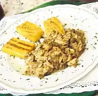 In the area of Bergamo and Brescia is known the dish of polenta e osei, where birds such as thrushes or larks are browned in butter or on the spit and served together with polenta,[13] to which is added the pork alla bresciana.[14] In the province of Mantua, beef stew and donkey stew are common: in general, stews are quite common in the lowlands, as in the case of Pavia-style stew.[15]