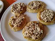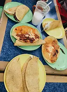 - El tlacoyo, originario de la antigua Tenochtitlan (concretamente de Tlatelolco)[21] y típico de todo el centro del país. Es parecida a una empanada, ovalada, de masa de maíz (azul, generalmente) y rellena con queso, nopal, cebolla, cilantro y salsa. También se le pueden agregar requesón, chicharrón, habas...