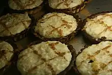 Hojaldre de San Lorenzo. Durante la celebración de la Virgen de San Lorenzo se sirve habitualmente pastas, hojaldres y otros postres.