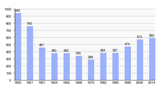 Los datos demográficos contemplados en este gráfico de la comuna de Gauville[4] se han cogido de 1800 a 1999 de la página francesa EHESS/Cassini, y los demás datos de la página del INSEE.[5]
