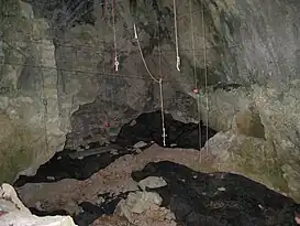 La cueva contiene sedimentos, que fueron divididos en seis niveles pertenecientes al Auriñaciense y siete niveles del Gravetiense. Los niveles inferiores están acreditados al Paleolítico Medio y los superiores abarcan desde el Magdaleniense de Europa Occidental (hace entre 17.000 y 12.000 años) hasta la Edad Media.