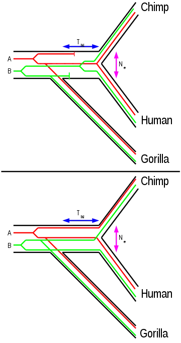 Cuanto menor es el intervalo de tiempo internodal (TIN), más comunes son los árboles de genes incongruentes. El tamaño efectivo de la población (Ne) de la población internodal determina cuánto tiempo se conservan los linajes genéticos en la población. Un tamaño de población efectivo más alto provoca árboles genéticos más incongruentes. Por lo tanto, si se conoce el lapso de tiempo internodal, se puede calcular el tamaño de población efectiva ancestral del ancestro común de humanos y chimpancés.