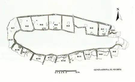 Genó, en definitiva, constituye una unidad habitacional perfectamente articulada con su entorno, hasta el punto que su control debió de ser tan efectivo y rentable como para permitir la estabilidad, lo que sugiere, al igual que la aparición de otros poblados con similar posición y en terrenos próximos, un reparto del territorio, sobre el cual el poblado ejercería su control visual y efectivo.