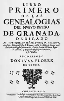 ![]() Portada de las Genalogías del Nuevo Reino de Granada. | ||