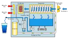 En un generador de agua atmosférica del tipo de condensación por enfriamiento, un compresor circula refrigerante a través de un condensador y a través de un serpentín o bobina evaporadora la cual enfría el aire que lo rodea. Esto baja la temperatura de aire a su punto de rocío, causando que el agua se condense. Un ventilador de velocidad controlada empuja el aire filtrado sobre la bobina. El agua resultante es entonces pasada a un tanque de almacenamiento con sistemas de purificación y filtración para ayudar a mantener el agua pura y reducir el riesgo provocado por virus y bacterias los cuales pueden ser recogidos del aire ambiental en el evaporador de bobina por el agua de la condensación.[5]