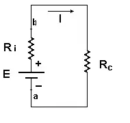 La F.E.M. (ε) se mide en voltios, y en el caso del circuito de la Figura 2 sería igual a la tensión E, mientras que la diferencia de potencial entre los puntos a y b, Va-b es dependiente de la carga Rc.