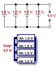 | Veq = V1 + V2 + V3 + V4 = 1,5 V + 1,5 V + 1,5 V + 1,5 V = 6,0 V |