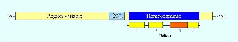 El homeodominio es un motivo de unión al ADN, el nombre de este motivo deriva de un término anterior, la homeosis, dicho término fue acuñado en 1894 por William Bateson para referirse a las variaciones naturales donde ciertas partes del cuerpo muestran características de otras regiones.[4] Tiempo después, este término es recuperado por Calvin Bridges para referirse a las mutaciones homeóticas, en las que la identidad de una parte del organismo es convertida en otra. Estas anomalías fueron descubiertas por Bridges (1923) en mutantes espontáneos de la mosca de la fruta Drosophila melanogaster, en las que encontró que poseían segmentos del cuerpo duplicados, como dos pares de alas en vez de uno. Este fenotipo fue bautizado como bithorax.[5] Cerca de 55 años después, Edward Lewis aisló y caracterizó el gen responsable del fenotipo bithorax, asignándole el mismo nombre.[6] Poco tiempo después, se encontraron otras mutaciones homeóticas asociadas a los genes Hox, por ejemplo, en el mutante antennapedia en el lugar donde deberían encontrarse las antenas surgen un par de patas perfectamente desarrolladas (Figura 4), luego se demostró que está mutación también estaba relacionada con un gen del complejo Hox. A partir de estos descubrimientos, se han logrado aislar e identificar muchas más proteínas con homeodominios, sin embargo, es importante señalar que no todas ellas se encuentran relacionadas con mutaciones homeóticas.[7]