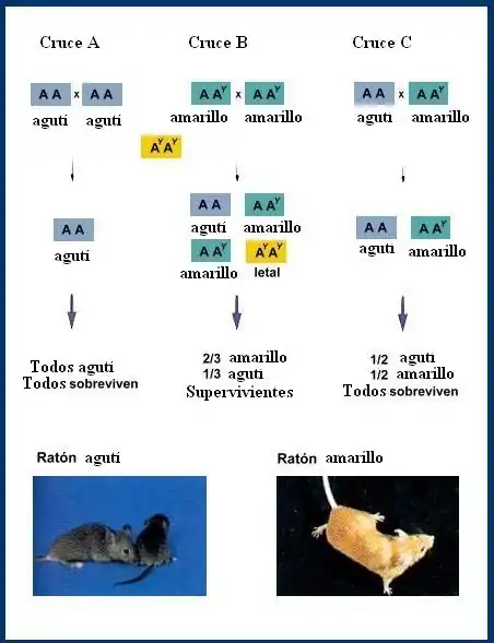 En cambio, los ratones cuyo genotipo es AY/A, son amarillos y los ratones cuyo genotipo es A/A presentan el fenotipo agutí.[1]