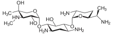 La gentamicina es un antibiótico del grupo de los aminoglucósido, producido por la Micromonospora purpurea,[1] utilizado como antibiótico de amplio espectro y acción bactericida para el tratamiento de infecciones causadas por bacilos gramnegativos, como Pseudomonas aeruginosa, Klebsiella pneumoniae o Proteus mirabilis. Aunque también es activo, en menor medida, para bacterias grampositivas, como Staphylococcus aureus o Enterococcus faecalis, se prefiere el uso de medicamentos menos tóxicos.[2][3] . Está contraindicado en casos de hipersensibilidad a los aminoglucósidos y en enfermedades como la insuficiencia renal o el botulismo y condiciones como el embarazo y la lactancia. No obstante, en todos los casos se tiene que considerar la relación riesgo-beneficio y los pacientes deben ser sometidos a vigilancia por los posibles efectos neurotóxicos (toxicidad en nervios), nefrotóxicos (toxicidad en riñones) y ototóxicos (toxicidad en oídos).[2][3]
