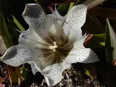Es una pequeña planta herbácea perenne que crece con tallos cortos que se encuentran en el suelo o reptando en la hierba . Las hojas son curvas en forma de lanza con forma de cuchara . El follaje es verde y puede tener coloración púrpura en los bordes y puntas . Las flores son solitarias o vienen en inflorescencias. Cada flor tiene forma de trompeta y hasta 5 o 6 centímetros de largo por 3 centímetros de ancho en la boca. Los lóbulos de la corola de las flores son redondeados a ligeramente puntiagudos . La superficie exterior de la flor es, en su mayoría, de color blanco con rayas violeta oscuro . La superficie interna puede ser ligeramente rayado de color verdoso o amarillento, y pecosa con un color similar. El fruto es una cápsula que contiene semillas aladas.