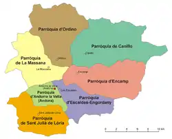 Andorra está dividida en siete territorios llamados parroquias. Son meramente administrativas sin autonomía propia; a su vez, tienen divisiones menores. Son: Canillo, Encamp, Ordino, La Massana, Andorra la Vieja, San Julián de Loria y Las Escaldas-Engordany