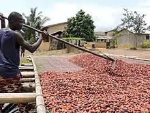 Costa de Marfil es el primer productor mundial de cacao, seguido de Ghana. En 2021 se detectó una superficie cultivada de caco de 3,69 millones de hectáreas (36.900 km2), frente a los 2,1 millones de Ghana.[7] Las plantaciones de árboles de cacao es la principal causa de deforestación del país, 3600 km2 desde 2000, el 37,4% de la deforestación total.[8] Hasta 2020 se había perdido el 75 por ciento de la cobertura forestal en solo 30 años. La producción de cacao aumentó de 1,45 millones de toneladas en 2013 a 2,23 millones de toneladas en 2023.[9] Sin embargo, la irregularidad de las lluvias debido al cambio climático se espera que provoquen una caída del 28,5% de la producción en 2023-2024.[10]