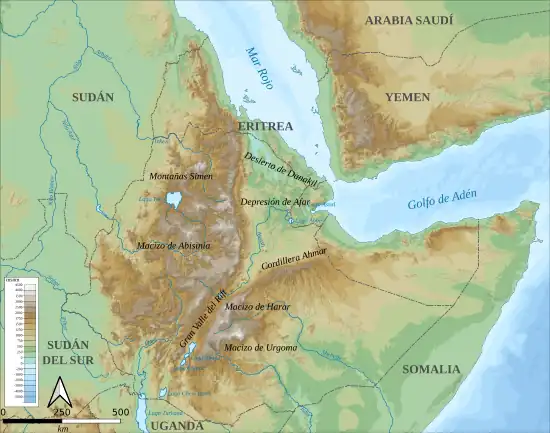 En casi todos los lados de la meseta central del macizo etíope, las montañas descienden bruscamente hacia las llanuras formando cadenas montañosas que marcan una clara división geográfica, salvo en el noroeste. En Eritrea, la pared oriental de la meseta discurre paralelamente al mar Rojo desde Ras Kasar hasta Annesley Bay, también conocida como golfo de Zula. Al entrar en Etiopía, la pared de la meseta desciende en línea recta hacia el sur a lo largo de 600km entre los 15ºN y los 9ºN, donde se produce un hundimiento por culpa de la falla del Rift, a través de la cual aflora el río Awash, que fluye hacia el este. Al otro lado del valle, que discurre a 1000m por debajo de la meseta, aparece otra cadena montañosa que sigue hacia el sur, y de la que surge una segunda cadena hacia el este, las montañas Ahmar, que llegan hasta el golfo de Aden.