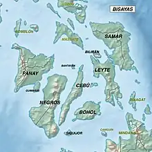 - Panay, en las Bisayas Occidentales, tiene 11 514 km². Está rodeada por las islas de Tablas y Sibuyán por el norte, Masbate por el nordeste, y isla de Cebú, Negros y Guimarás por el sudeste.[9] La isla está dividida por la cordillera Central de Panay, que culmina en el monte Madia-as, de 2117 m., montaña sagrada donde vive el Sidapa, dios de la guerra y la muerte.[10]
