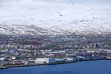 En Akureyri, al norte de la isla, protegida de los vientos húmedos del sudoeste, las precipitaciones son muy inferiores, unos 485 mm anuales, con un mínimo de 20 mm y 5 días de lluvia en mayo, y un máximo de 60 mm y 11 días de lluvia en octubre. Puesto que se halla en un fiordo protegido, las temperaturas son suaves y el mar no se hiela en invierno. Las medias oscilan entre -4.oC y 2.oC en enero, y entre 9.oC y 15.oC en julio.[5]