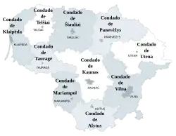 Está dividida administrativamente en diez condados (apskritys, en singular apskritis); Alytus, Kaunas, Klaipeda, Mariampol, Panevezio, Siauliu, Taurage, Telsiai, Utena y Vilna.
