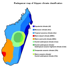 El clima es tropical a lo largo de la costa, templado en el interior y árido en el sur. El tiempo está dominado por los alisios que se originan en el anticiclón del océano Índico. Madagascar tiene dos estaciones, una cálida y húmeda de noviembre a abril, y una seca y fría de mayo a octubre. hay una gran variación, sin embargo, según la altitud y la posición respecto a los vientos dominantes.