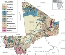 Geológicamente, Malí consiste en una vasta llanura de granito y esquistos arcillosos cubiertos por arenisca y cuarzo aluvial.[13] Malí se extiende sobre dos estructuras geológicas, el cratón de África Occidental, al oeste, y el escudo Tuareg, en el sudeste.[14] Ambos se formaron al final de la era Precámbrica hace entre 600 y 550 millones de años. La zona de sutura se halla al oeste de las montañas Adrar de los Iforas.[15]