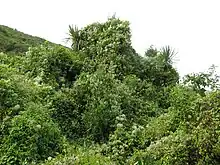Las laderas más bajas de la montaña están cubiertas de bosque autóctono. Por encima, hay arbustos y, a continuación, gramíneas. La tundra alpina se compone de plantas en cojín y campos de hierbas; muchas de estas plantas tienen flores blancas y amarillas.[25]