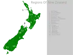 Nueva Zelanda consta de 16 regiones, 7 en la Isla Sur y 9 en la Isla Norte. Nueva Zelanda también tiene un número de islas apartadas que no se incluyen en los límites regionales. Las Islas Chatham no son una región, aunque su concejo opera como una región bajo el Resource Management Act. Las Islas Kermadec y las Islas subantárticas están habitadas solo por un pequeño número de miembros del Departamento de Conservación de Nueva Zelanda.