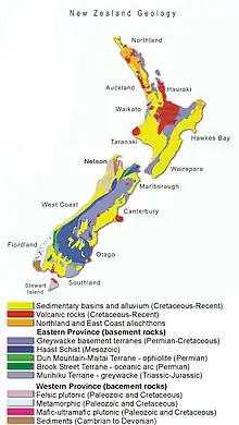 - Taonga, New Zealand Ministry for Culture and Heritage Te Manatu. «Geology and landforms». teara.govt.nz (en inglés). Consultado el 28 de agosto de 2021.
