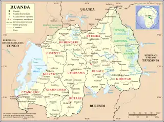 Ruanda es un país interior que se encuentra en el este de África. Limita al norte con Uganda, al sur y al este con Tanzania y al oeste con la República Democrática del Congo. La frontera con la República Democrática del Congo está establecida en gran medida por el lago Kivu (ver República Democrática del Congo). Es un país muy accidentado, con muchas subidas y bajadas, por lo que se le conoce como el país de las mil colinas.