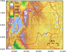 La mayor parte de la frontera occidental de Ruanda atraviesa el lago Kivu, que ocupa el fondo del Rift Albertino. Tiene una profundidad de 480 m y es uno de los más profundos del mundo.[2][3]