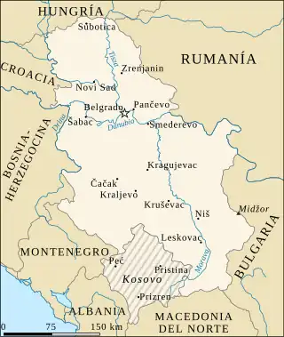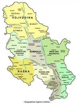 - Esta obra contiene una traducción derivada de «Géographie de la Serbie» de Wikipedia en francés, publicada por sus editores bajo la Licencia de documentación libre de GNU y la Licencia Creative Commons Atribución-CompartirIgual 4.0 Internacional.