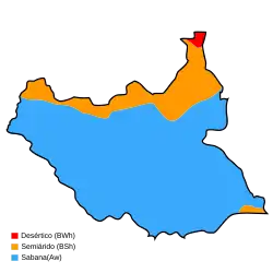 En Yuba, en el sur, a 500 m de altitud, caen 960 mm en 108 días, con más de 100 litros entre mayo y octubre, y menos de 5 en diciembre y enero. Las temperaturas oscian entre los 37 °C de las medias máximas en febrero y mayo y las 19 °C de las mínimas en invierno.[12]
