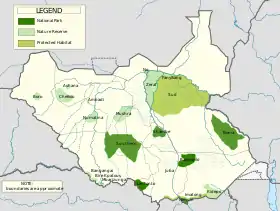 En total, hay protegidos unos 143.000 km² en 23 áreas que comprenden el 15 por ciento del territorio. La mayor área protegida son los humedales de Sudd, que cubren 57.000 km² y es considerado zona Ramsar, con unas 400 especies de aves, 100 especies de mamíferos y 100 especies de peces. En muchas de estas áreas se practica la caza ilegal y la ganadería.