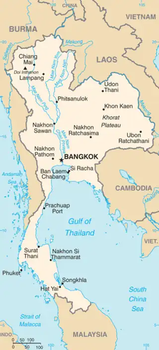 Tailandia comparte frontera con Camboya, Laos, Malasia y Myanmar. Si bien ni China ni Vietnam limitan con Tailandia, sus territorios están a menos de 100 km del territorio tailandés.