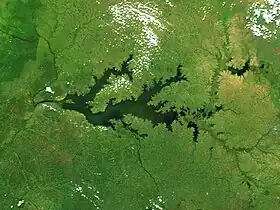 El resto del país es una amplia meseta dominada por el lago Victoria, al sur, a 1.134 m de altitud, dividido a partes iguales entre Uganda y Tanzania, de las que 31.000 km² pertenecen a Uganda, y el lago Kyoga, a 914 m, de aguas muy someras, en el centro del país, alimentado a su vez por el Nilo Blanco procedente del lago Victoria por el sur y de una serie de caudales que proceden del este, de la frontera con Kenia, donde se encuentra el monte Elgon, un volcán aislado extinto de 4.321 m que forma parte de una cadena de volcanes de este tipo al este del país, entre los que destacan el monte Moroto, de 3.083 m, el monte Kadam, de 3.063 m, y el monte Morungole, al norte, de 2.749 m.[5]